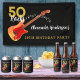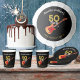 50 Rocks 50th birthday party invitations with a cool electric guitar with Fire flame pattern and red pick guard guitar art and musical notes illustration with personalised black and gold modern calligraphy typography. This easy to use template creates the perfect personalised invitation to celebrate fifty in rock n roll style and is ideal for a guitarist, musician and music lovers. Any guitar player will tell you that you can never have too many guitars. This cool modern musical instrument design celebrates the music energy of this wonderful musical instrument and is the perfect way to rock a fiftieth birthday celebration. Original artwork by artist Catherine Sweetman