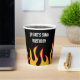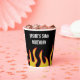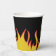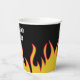 Throw a rocking birthday bash with personalised party supplies like these paper cups featuring illustrations of flames in yellow and red set against a black background. Your custom message is spelled out in white heavy metal style lettering.