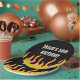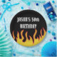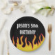 Throw a rocking birthday bash with personalised party supplies like these paper plates featuring illustrations of flames in yellow and red set against a black background. Your custom message is spelled out in white heavy metal style lettering.