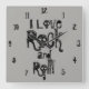 Cool musical themed wall clock. With the wording, I Love Rock and Roll in black text on a gray background. Fun skull heads are in place of the letters o. Numerals are in a cool rock font. PERSONALIZE with YOUR saying or company name (insert in place of my sample text). Fun clock for a bedroom, family room, dorm room, etc. Design layout by TamiraZDesigns. Visit my Store to see more original items: www.zazzle.com/tamirazdesigns*