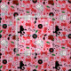 Funky rockabilly patterned fabric with a vintage 1950s design of black poodles, dice, cherries and sunglasses over pink musical notes and stripes