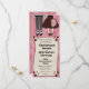 A couple in rockabilly style outfits hold hands over a grungy alternative background, with texts on a scroll like banner and featuring some punk like floating stars as highlights. The bride wears a black and red polka dotted dress, a pair of skull buckled shoes and carries a large bunch of pink roses. The groom wears some grey tartan turned up pants, some black and white wingtip shoes, and a tuxedo jacket.