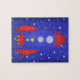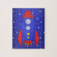 A blue and red rocket ship soars through space, in this young space lovers design!