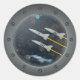 Spaceship porthole with three rockets, stars, a planet, and space dust. The rockets have customisable text. Text should be initials or kept short in order to fit on to the rocket.