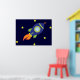 A fun rocketship flying through the stars. Blue, green, orange, red, yellow and purple colours.