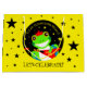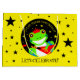 Celebrate your child's irst birthdays with this whimsical design, which features a cute tree frog with flaming red spiked hair, rocking a red guitar on starry black and bright yellow backgrounds!