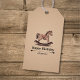 A gift tag with a gradient and textured beige background and an illustration of a handcrafted rocking horse in brown tones. Perfect to your gifts to a kid.