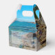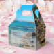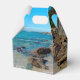 This beach design features a rocky shoreline. The picturesque setting combines greenery, blue ocean, rocky coastline and golden sand. The wording is elegantly framed with a simple white opaque border background. This is the perfect beach destination wedding design ideal for a summer or seaside wedding. Elegant and romantic beach wedding favour box design with modern elements. Matching wedding invitations and other stationery items are also available.