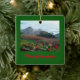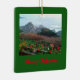 This Christmas ornament features a scenic, rocky 101 California coastal highway scene. Merry red flowers dot the hillside as the vista sweeps into the rocky Pacific coastline, as thunderous waves crash onto huge boulders. This orignal photograph was taken near Rocky Point Restaurant, south of Carmel-by-the-Sea and Garrapata State Beach along the Cabrillo Highway. The image is in colour, with red "Merry Christmas" text, against a green background.