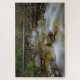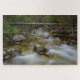 Jigsaw puzzle with water with motion blur in a rocky creek in a fall forest in Norway with a fallen tree as a bridge over it.