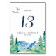 This Rocky Mountain destination wedding table number is perfect for an outdoor wedding. The design features a blue and green painted wilderness landscape with watercolor pine trees, birds and mountains. The card prints on the front and back (double-sided). Add each table number that you need to your cart individually.