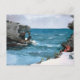 A postcard with the fine art watercolor painting by Winslow Homer titled, Rocky Shore, Bermuda (1900). A cove in the Caribbean with brilliant blue water and rocky cliffs.