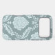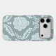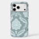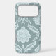 A vintage style decorative damask off-set surface pattern influenced by rococo classical design in duck egg blue color detail on a teal background.
