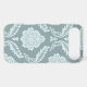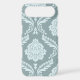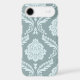 A vintage style decorative damask off-set surface pattern influenced by rococo classical design in duck egg blue color detail on a teal background.