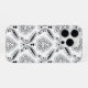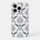 A vintage style decorative damask surface pattern influenced by rococo classical design in black line and leaf fill details on a white background.