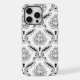 A vintage style decorative damask surface pattern influenced by rococo classical design in black line and leaf fill details on a white background.