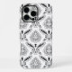 A vintage style decorative damask surface pattern influenced by rococo classical design in black line and leaf fill details on a white background.