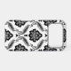 A vintage style decorative damask surface pattern influenced by rococo classical design in black and grey details on a white background.