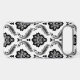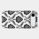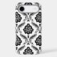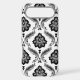 A vintage style decorative damask surface pattern influenced by rococo classical design in black and grey details on a white background.