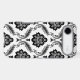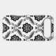 A vintage style decorative damask surface pattern influenced by rococo classical design in black and grey details on a white background.