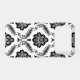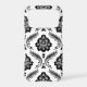 A vintage style decorative damask surface pattern influenced by rococo classical design in black and grey details on a white background.