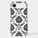 A vintage style decorative damask surface pattern influenced by rococo classical design in black and grey details on a white background.
