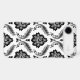 A vintage style decorative damask surface pattern influenced by rococo classical design in black and grey details on a white background.