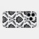 A vintage style decorative damask surface pattern influenced by rococo classical design in black and grey details on a white background.