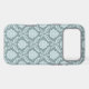A vintage style decorative damask surface pattern influenced by rococo classical design in duck egg blue color detail on a teal background.