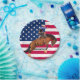A bucking horse and rider get some air over an American flag during a bull riding competition.