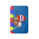 A cartoon rodeo clown in a barrel that says RODEO. There is a bull behind the clown and rodeo arena flags at the top. Printed on bathmat.