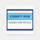 Codify Roe Women are People. Codifying Roe should be the floor of women's healthcare rights, not the ceiling. And now even that doesn't exist. Tell Congress it's time that they do the very least they can do for women's health, safety, and equality, because women are people, and abortion, whatever the reason, is healthcare. Design description: The design space is a white background with a dark blue border. In the top half of the design space, the words, "Codify Roe" in a dark blue sans serif font. Underneath that, a wide light blue stripe with matching dark blue top and bottom borders. Below the stripe, in the bottom half of the design, the words, "Women are people."
