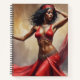 Una acuarela que captura la esencia de la danza del vientre. La bailarina de piel oscura resplandece con un traje rojo que refleja su pasión y energía.