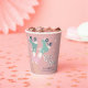 Fun pastel pink roller skating birthday paper cups featuring a retro-inspired illustration of teal roller skates on a girl wearing pink-striped tube socks and "Let's Roll" in a 70's style script. Add her name dark teal blue typography.