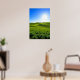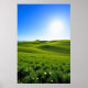 A vibrant spring landscape with rolling green hills, wildflowers, and a bright blue sky. A fresh and peaceful natural scene.