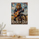 This imaginative artwork showcases a lion, a true rock star with sunglasses and a leather jacket, unleashing "rolling thunder" with an electric guitar solo. Its stage is a rustic wooden wheel in a golden field under a wide sky. The bold, textured strokes give a raw, energetic feel to the scene, perfectly capturing the "Rock or Die" attitude of this unexpected wilderness performance.