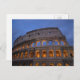 A striking photo of the roman colosseum which is an ancient landmark in Rome, Italy. An interesting angle and perspective. Shot at night with the arches lit up and glowing orange. The sky has dark blue stormy clouds above.