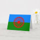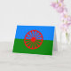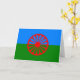 This design features the Romani flag, which is the international flag of the Romani people. The flag consists of a background of blue and green, representing the heavens and earth, respectively; it also contains a 16-spoke red chakra, or cartwheel, in the center, which represents the itinerant tradition of the Romani people and is also an homage to the flag of India. The flag was approved by the representatives of various Romani communities at the first World Romani Congress (WRC), held in Orpington in 1971.
