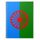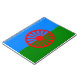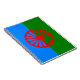 This design features the Romani flag, which is the international flag of the Romani people. The flag consists of a background of blue and green, representing the heavens and earth, respectively; it also contains a 16-spoke red chakra, or cartwheel, in the centre, which represents the itinerant tradition of the Romani people and is also an homage to the flag of India. The flag was approved by the representatives of various Romani communities at the first World Romani Congress (WRC), held in Orpington in 1971.