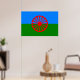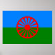 This design features the Romani flag, which is the international flag of the Romani people. The flag consists of a background of blue and green, representing the heavens and earth, respectively; it also contains a 16-spoke red chakra, or cartwheel, in the centre, which represents the itinerant tradition of the Romani people and is also an homage to the flag of India. The flag was approved by the representatives of various Romani communities at the first World Romani Congress (WRC), held in Orpington in 1971.