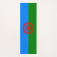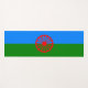This design features the Romani flag, which is the international flag of the Romani people. The flag consists of a background of blue and green, representing the heavens and earth, respectively; it also contains a 16-spoke red chakra, or cartwheel, in the centre, which represents the itinerant tradition of the Romani people and is also an homage to the flag of India. The flag was approved by the representatives of various Romani communities at the first World Romani Congress (WRC), held in Orpington in 1971.