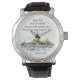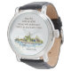Watch with inspirational quote scripture depicts a simple watercolor landscape including a house on the lake with trees and sea grass. It features an encouraging Christian Bible Verse Romans 15:13, "May the GOD of HOPE fill you with all JOY and PEACE as you trust in Him."