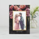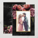 Romantic and moody, this formal wedding Save the Date is perfect for a modern elegant wedding. The moody floral design features a natural bouquet of blush pink roses and stunning ranunculus with dark green leaves in a luxurious arrangement on a dark black watercolor background.