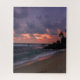 The fading sunlight creating beautiful pink and orange hues in the sky, making silhouettes of the palm trees and highlighting the gentle surf. Tranquil beach scene.