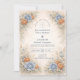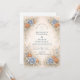 This romantic wedding design features soft blue and peach florals arranged in a delicate garden composition. Inspired by wildflowers and classic botanical illustrations, the artwork blends muted neutrals with airy florals for a timeless, refined look. The elegant layout and gentle color palette make it ideal for couples planning a nature-inspired wedding with a graceful, understated aesthetic that feels both modern and enduring.