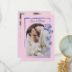 A unique wedding thank you card in pink with a deep blue illustration of a rose framing one side of your arch-shaped wedding photo. The illustration is drawn by hand and merged into the printed sketched frame. The double-sided floral wedding thank you card has a printed thank you message on the back. Keep it as is, change it, or delete it to write something by hand. Personalize with two photos from your gorgeous wedding!