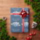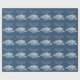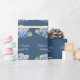 This wrapping paper features a floral watercolor design with blue hydrangeas over a navy blue background. A delicate bouquet of hydrangea flowers is pictured below the names of a couple, followed by a sample wedding date and location. You can personalise the wrapping paper to include your own names or other custom text.
