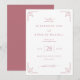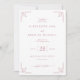 This elegant wedding invitation features a symmetrical layout with a soft blush pink background, creating a warm and inviting atmosphere. The design includes mirrored geometric corner motifs in a slightly darker shade of pink, adding an abstract yet sophisticated touch. Centred text is arranged hierarchically using delicate script and serif fonts, emphasising the names and event details while maintaining a timeless appeal. The overall style blends classic and contemporary elements, perfect for conveying formality and grace, making it ideal for celebrating a significant life moment with warmth and refinement.