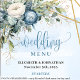 Pair with matching invitations, place cards, and table numbers for a cohesive, stylish look. Make your reception unforgettable with this dusty blue and gold floral menu — the perfect finishing touch for your elegant wedding day.