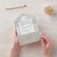 This elegant pattern features a classical landscape scene with stone steps of an ancient temple, columns, urns, greenery and trees in subdued light and dark sage green tones. Includes an opaque label element with a thin border (the level of opacity can be customized in the design editor). This all-in-one format also includes a bonus RSVP tearaway card.